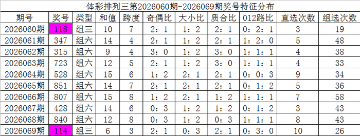 开奖公告:体彩排列三第2026069期开出奖号:114。组三,有重号:4,奇偶比2:1,大小比0:3,012比0:3:0,和值6,跨度3。